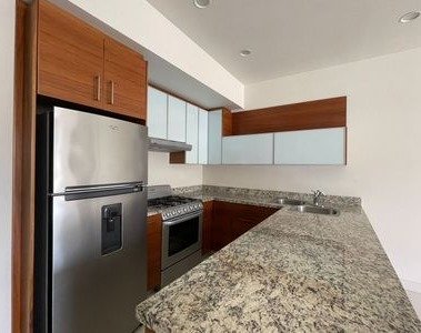 - Cocina equipada con estufa, campana, refrigerador y acabados en cuarzo y nogal